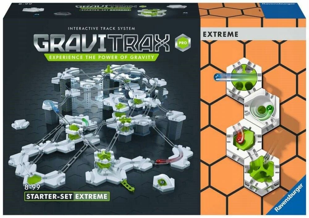 В стартовый набор GraviTrax PRO Extreme входит 195 деталей! GraviTrax PRO Extreme содержит большую часть деталей из стартового набора PRO и 4 дополнительных элемента GRAVITRAX PRO – Винтовой спуск, Поворотный стол, Миксер, Распределитель. Комбинируя элементы, рельсы и строительные блоки, ваши дети смогут дать волю своему творчеству, будут создавать экспериментальные маршруты для движения шариков. С GraviTrax возможности строительства безграничны! Благодаря разнообразным элементам и вариантам шарики смогут двигаться на полной скорости, преодолевать невероятные препятствия, падать или даже подниматься вверх. Дети откроют для себя удивительные законы гравитации. GraviTrax PRO Extreme можно легко комбинировать со всеми продуктами Gravitrax.