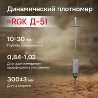 Плотномер RGK Д-51 позволяет определить степень уплотнения песчаной подушки на глубине от 10 до 30 см. Диапазон измерения коэффициента уплотнения - от 0.84 до 1.02. Инструмент применяется для оценки сухих немёрзлых грунтов, в которых содержание твердых частиц размером более 2 мм не превышает 25%.