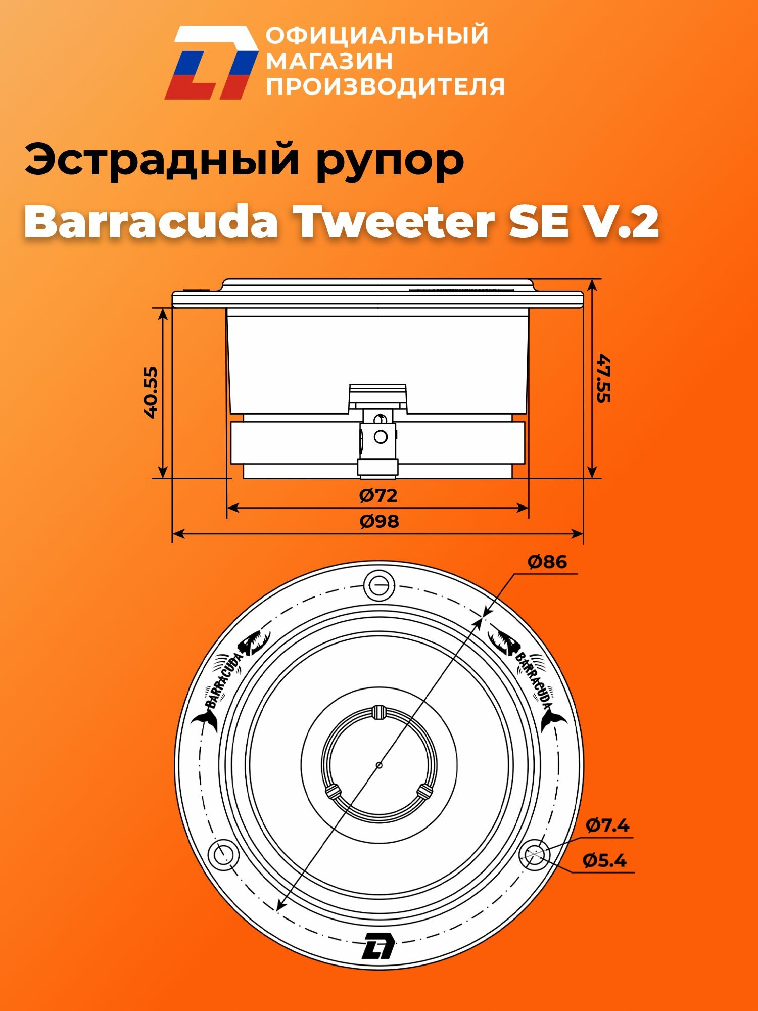 Официальная гарантия 2 года, а так же доступ к программе подменного фонда. Barracuda Tweeter SE V.2 Громкий эстрадный рупор с уникальными возможностями по изменению внешнего вида с помощью встроенной RGB-подсветки. Уникальные фирменные зажимные терминалы для удобства инсталляции. Фирменный корпус со встроенной мультицветной подсветкой. Увеличенный уровень чувствительности за счет применения высокосортного феррита. Конденсатор в комплекте. - Номинальный диаметр: 98 мм Номинальная мощность: 40 Вт Частотный диапазон: 2 200 – 20 000 Гц Номинальное сопротивление: 4 Ом Средняя чувствительность: 98.8 дБ Диаметр звуковой катушки: 1 дюйм - Установочные размеры: Внешний диаметр: 98 мм Посадочная глубина: 40.55 мм Диаметр монтажного отверстия: 72 мм Расстояние по крепежу: 86 мм - С этим так же покупают Динамики автомобильные 16 см DL Audio Gryphon Lite 165 V.3 Колонки автомобильные мидбас 16,5 см DL Audio Gryphon Pro 165 Midbass Усилитель автомобильный DL Audio Piranha 2.60 Колонки в машину/Колонки автомобильные/Колонки/Динамики/Динамики в машину/Динамики автомобильные/Пищалки/ВЧ/Твитеры