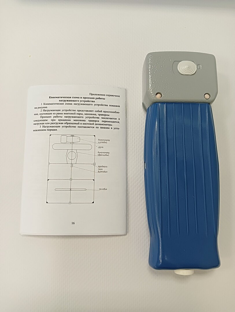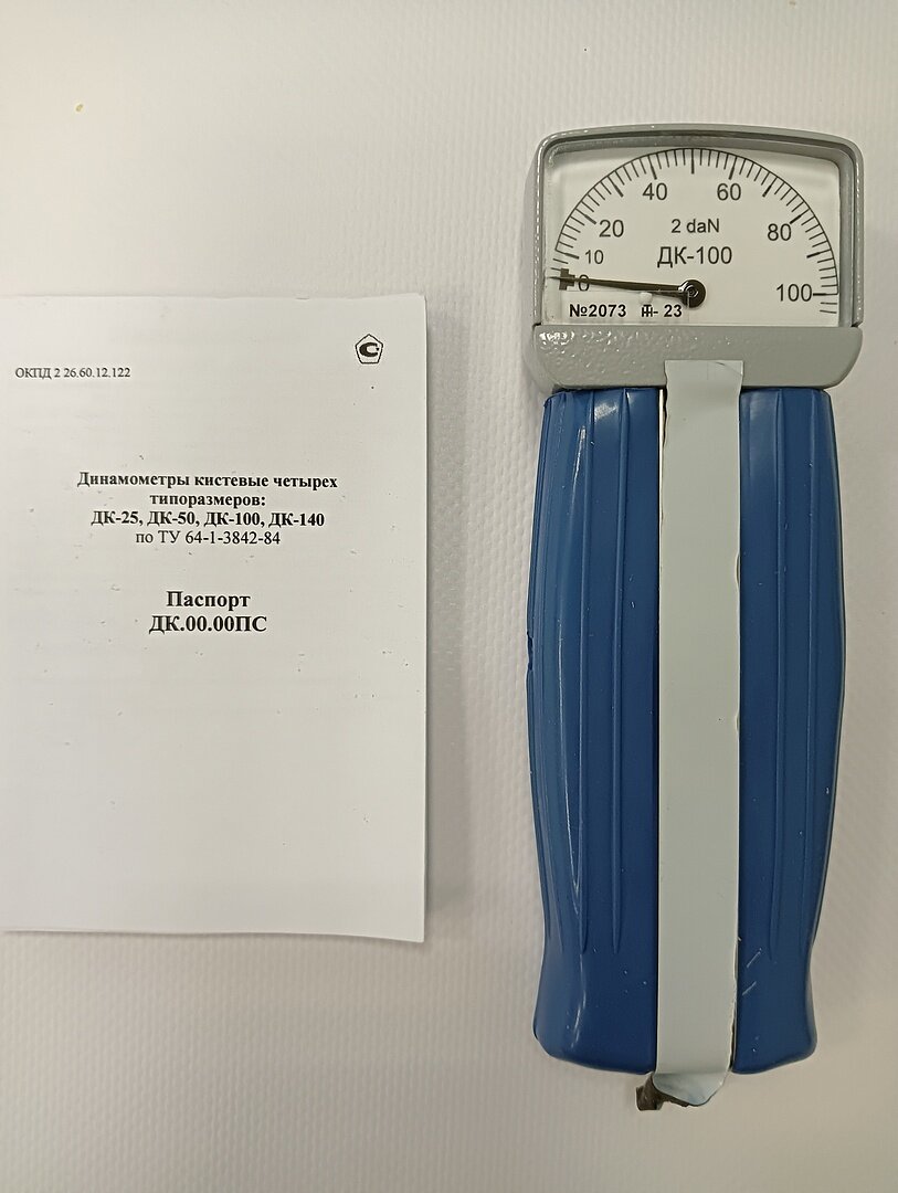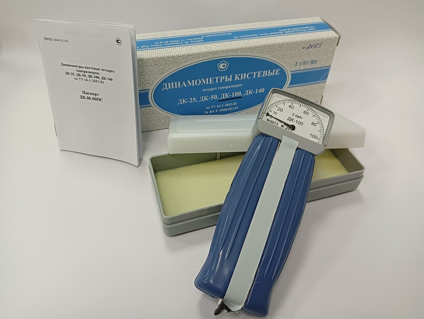 Динамометр для взрослых ДК-100 для измерения мышечной силы кисти. Диапазон измерений 10-100 даН. Предел допускаемой погрешности 3 даН. Применяется в клиниках, поликлиниках, больницах, диспансерах, санаториях и спортивных учреждениях. Динамометр выпускается четырех типоразмеров. ДК-25 - для детей и ослабленных больных, ДК-50-для женщин и подростков, ДК-100-для мужчин, ДК-140- для спортсменов. Основные детали изготовлены: силовая пружина из пружинной стали с никелевым покрытием, оболочки - из поливинилхлоридного пластиката. Как работает: Принцип работы основан на законе физики, согласно которому возникающая в пружине деформация прямо пропорциональна приложенному усилию. Для получения наиболее точных показаний измерения проводят стоя. Прибор держат рукой, вытянутой вперед параллельно полу. Рукоять сжимают как эспандер, приложив максимальные усилия. Измерения проводят трижды с минутным интервалом для отдыха. Наиболее точным будет среднее значение между тремя полученными показателями.