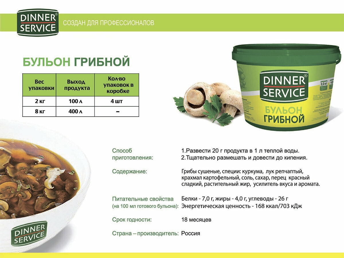 DINNER SERVICE Бульон грибной, 2 кг: сравнение цен, характеристики, фото, актуальное наличие и цены.
