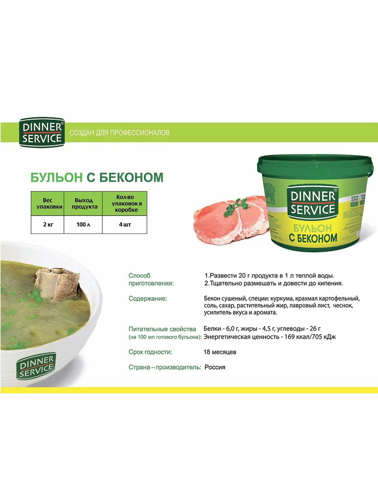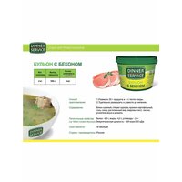 Бульон "DINNER SERVICE" со вкусом бекона придаст станет прекрасной основой для супа-солянки или горохового супа, а также прекрасно дополнит блюда из картофеля, салаты или выпечку с добавлением бекона. Бульоны получаются прозрачные, позволяющее создавать блюдо, полностью идентичное натуральному. Стабильны в мармите и обладают стабильным насыщенным вкусом. Способ приготовления бульона: За 5 минут до готовности добавить в блюдо и тщательно перемешать. Расход: 20гр (столовая ложка) на литр продукта (из 2 кг сухого бульона DINNER SERVICE можно приготовить 100 л бульона).
