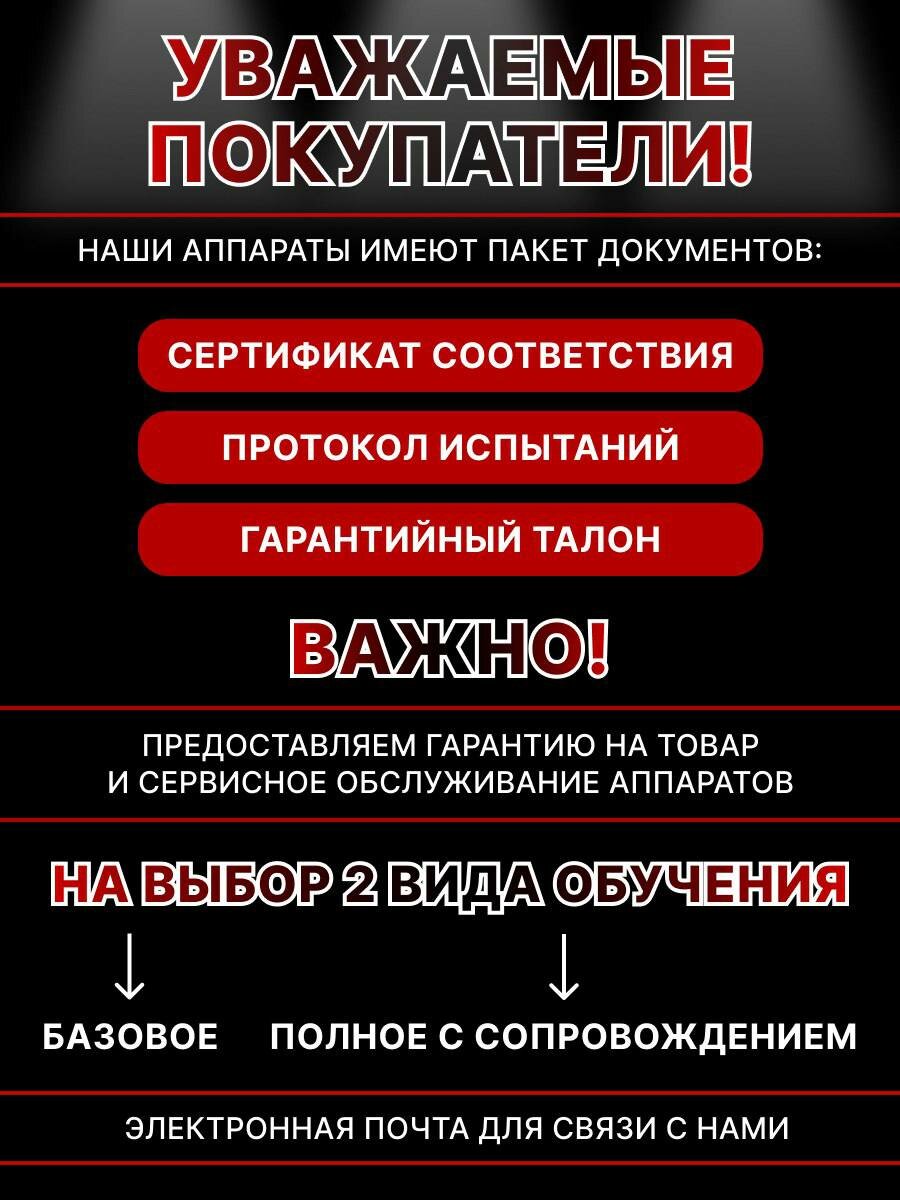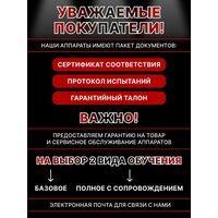 Индивидуальное полное обучение в онлайн формате! После получения аппарата с вами связывается наш специалист для обучения и сопровождения. Наши косметологические аппараты высокого качества, сертифицированы, качественные и сборка «премиум класса», в отличии от других аналогов китайских продавцов. Каждый прибор перед отправкой проверяется на работоспособность. Корпус из качественного, крепкого пластика и металла. Внимание! Лазер можно включать только после того как залили дистиллированную воду! Лазерная эпиляция — один из самых эффективных способов избавиться от нежелательных волос, причем как для женщин, так и для мужчин. Это многофункциональный косметологический инструмент, объединяющий три технологии IPL, RF и мощную систему охлаждения. Принцип действия прибора состоит в том, что мастер настраивает аппарат под параметры клиента, наносит специальный гель и водит манипулой по зоне эпиляции, воздействуя вспышками лазера на волосяные фолликулы. Кожа при этом не травмируется, лазер проникает только на глубину залегания волос. Диодный лазер имеет 3 волны 755; 808; 1064 нм и один из безболезненных систем лазерной эпиляции для всех фототипов кожи. Аппарат оснащен охлаждающим сапфировым наконечником. Удаляет даже тонкие и светлые волосы Характеристики устройства -Размер пятна 15/15мм - Мощность излучателя – 1000 Дж. - Электропитание 220-110В, 50Гц. - Частота работы – 10 Гц. - Мощность оборудования – 1200Вт. - Длина волны – гибридная на 1064, 808, 755 нм - Длительность импульса – 10-400мс. - Количество манипул – 1 - Тип охлаждения – полупроводник, вода, воздух. - Охлаждение насадки – до -4 С. - Плотность энергии 1-166 Дж/см2. - Дисплей – 10, 4 LCD. - Ресурс манипулы – 20000000.