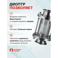 Диоптр предназначен в первую очередь для контроля за процессом укрепления самогона или процессом ректификации. Но многие устанавливают его исключительно из интереса — чтобы понаблюдать за тем, что происходит внутри аппарата. Обычно диоптр используется в пленочных и ректификационных колоннах.