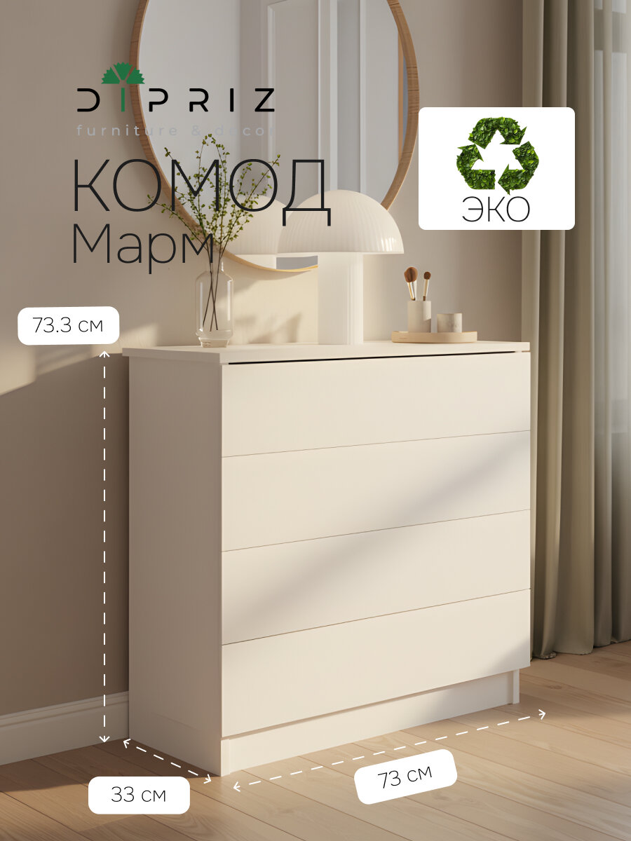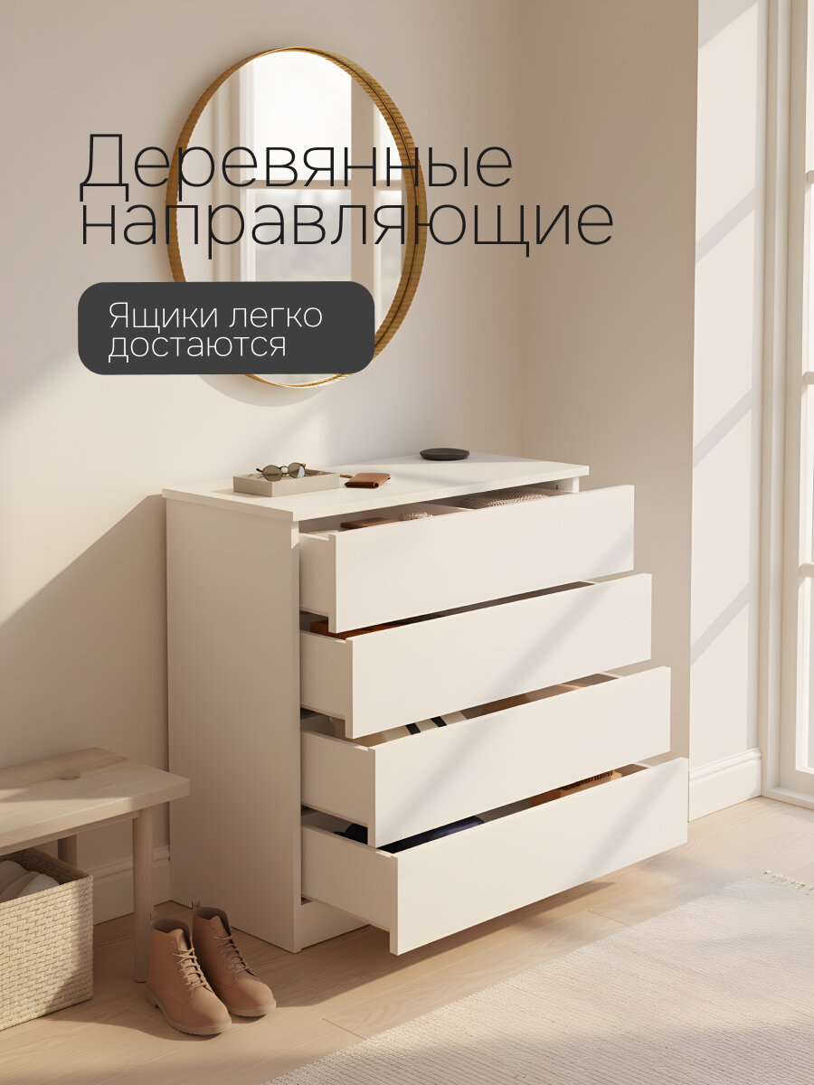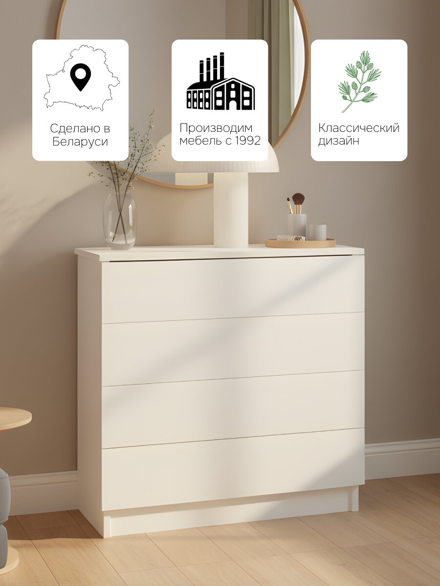 Комод Марм отлично подойдет для игрушек и детских вещей, для белья и одежды, для косметики, для книг и инструментов. Белый комод 4 ящика создаст порядок в любой комнате, будь то прихожая, спальня, гостиная, ванная или детская комната. Комод деревянный может быть использована как тумба под телевизор, особенно если совместить несколько комодов вместе. Ящики комода для вещей Марм можно использовать для хранения вещей одного типа или тематически разделить их по назначению. Например, верхний ящик использовать под носки, перчатки и шарфы, средние - под футболки и майки, нижний - под пижамы и домашнюю одежду. В комплекте с белым комодом для одежды дополнительно поставляются органайзеры для хранения. Комплект представляет собой 3 разделителей, которые можно установить внутри выдвижного ящика при сборке в нужном количестве. Также улучшили направляющие - теперь комод белый с ящиками комплектуется металлическими роликовыми направляющими, которые будут плавно выдвигаться и тихо закрываться, более надежны и долговечны. Комод деревянный с ящиками изготовлен белорусским производителем "Диприз" из высококачественного ЛДСП. Для задней стенки комода и дна ящиков использовалось ДВП белого цвета. Деревянный комод с ящиками выполнен на высокоточном оборудовании, все кромки изделия обработаны промышленным методом на современных станках, что обеспечивает ее плотное прилегание и прочность древесного слоя при контакте с влагой, устойчивость к влаге и деформации. Расположив комод в прихожую, вы сможете организовать хранение обуви, аксессуаров и других необходимых предметов, сохраняя порядок и чистоту в вашем входном пространстве. Деревянный комод можно использовать с письменным столом для создания удобного офиса. Если вы обустраиваете детскую комнату, наш детский комод станет прекрасным дополнением к интерьеру, чтобы получился замечательный комод для игрушек. Поставьте его в спальню, и получится хороший комод для вещей с ящиками или прикроватная тумба. Сборка комода с органайзером домашних условиях не вызовет трудностей за счет понятной инструкции по сборке и комплекта необходимой фурнитуры. Наша компания обеспечивает надежную упаковку товара с дополнительной защитой для предотвращения повреждений при транспортировке. Белый комод в скандинавском стиле Марм – это современное сочетание стиля и функциональности. Минималистичный дизайн и просторные ящики делают его идеальным выбором для хранения вещей и создания стильного интерьера. Комод для одежды отлично впишется в комнаты современного и скандинавского стиля, бохо, лофт, минимализм. Выбирая стильный и экологичный комод Марм, вы делаете ответственный выбор в пользу природы и создаете функциональное и эстетичное пространство для хранения вещей в вашем доме. Подчеркните уникальность и создайте свое уютное домашнее пространство с нашей мебелью. Мы заботимся о Вашем удобстве!