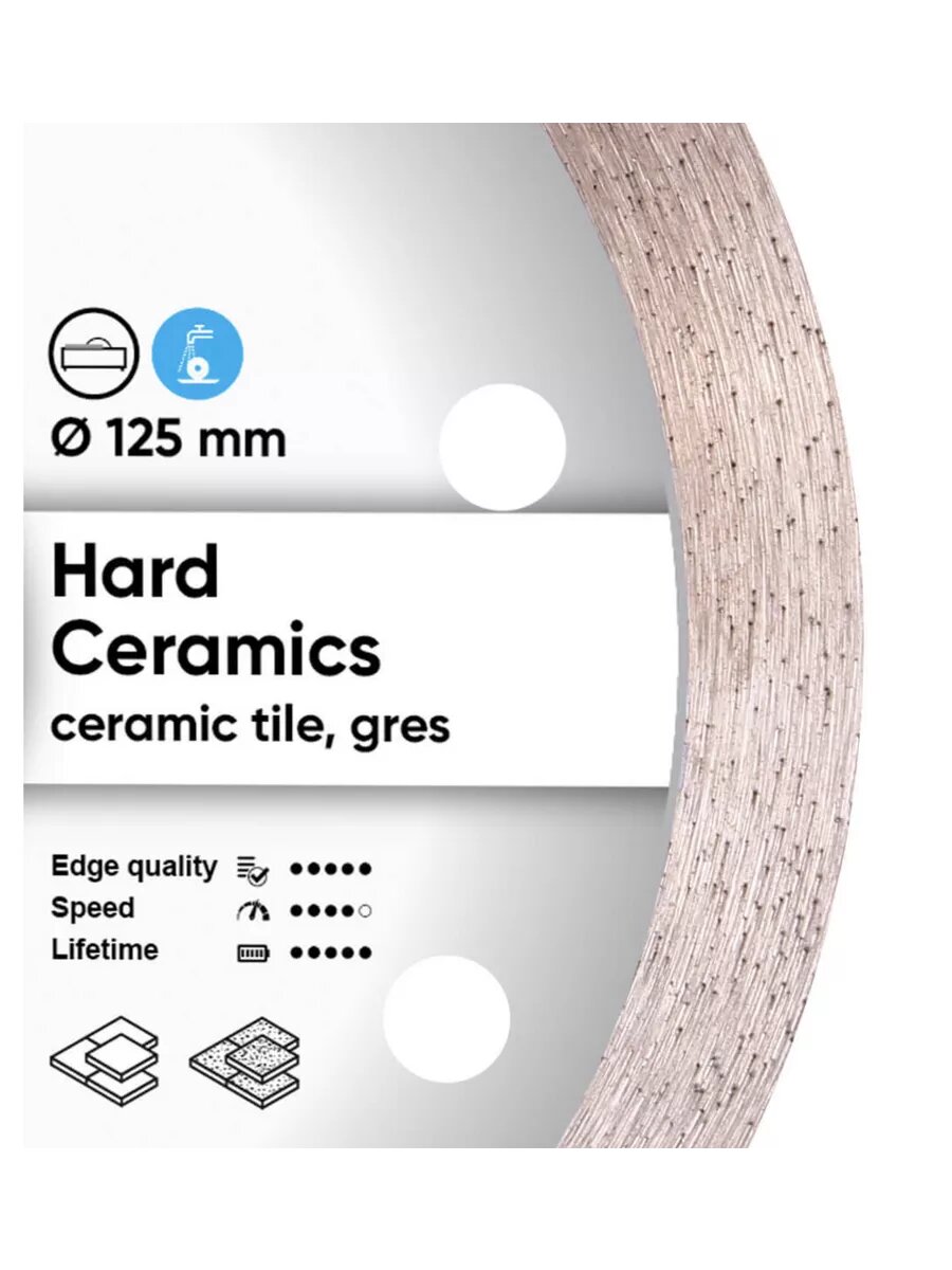 Алмазный круг 1A1R Hard ceramics со сплошной режущей кромкой незаменим для работы с настенной и напольной керамической плиткой. Обладает хорошим соотношением цены и качества. Преимущество данного диска в том, что он оставляет тонкий и чистый рез не только на простой керамической плитке и керамограните, но и на плитке с рельефной глазурью.