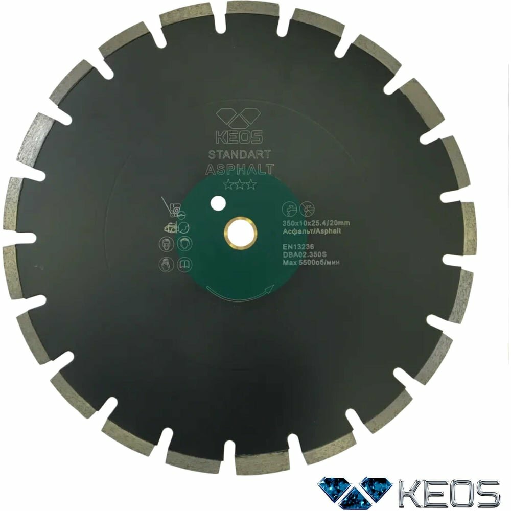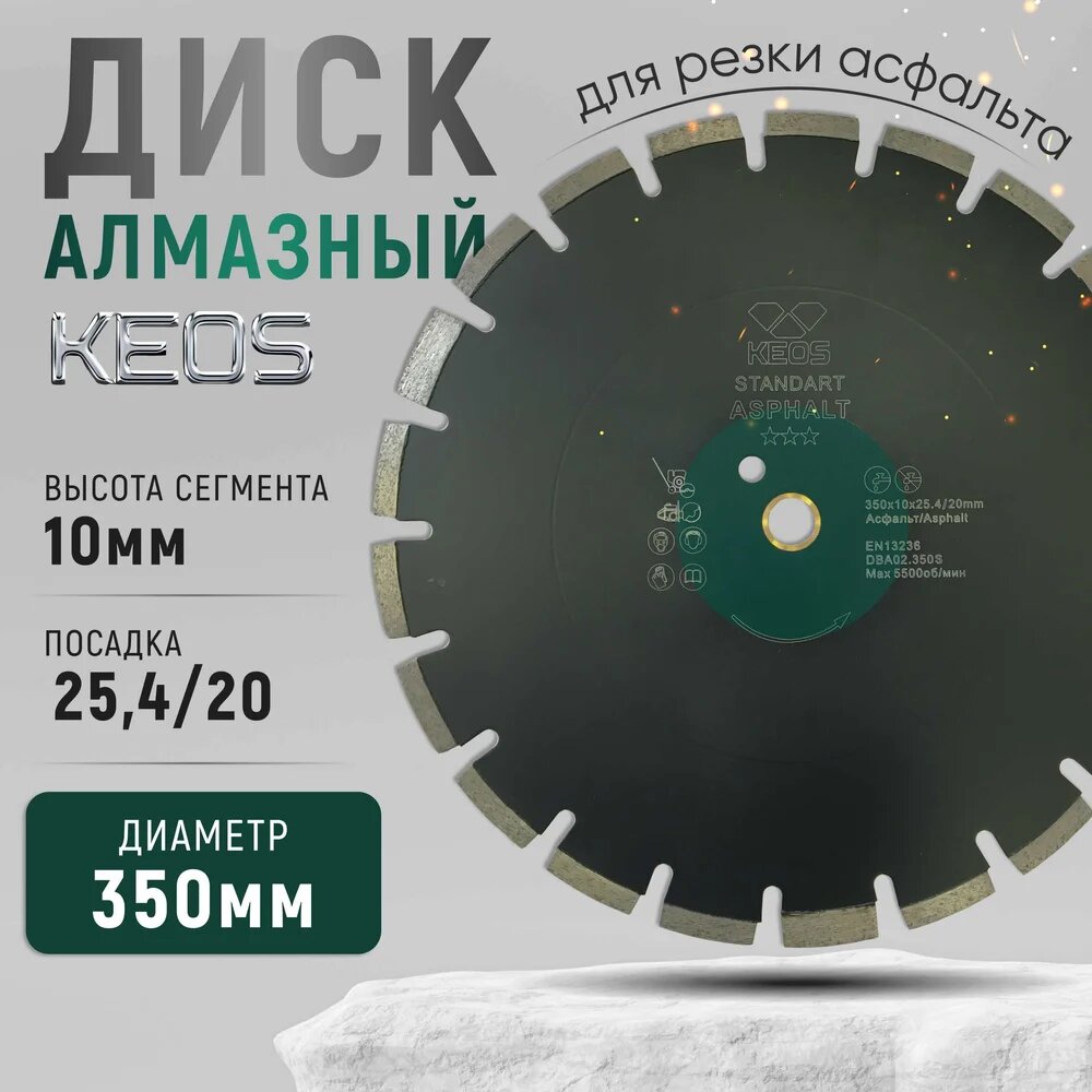 Алмазный диск KEOS Standart l (асфальт) DBA02.350S предназначен для резки асфальта и асфальтобетона на бензиновых и электрических резчиках мощностью до 8 кВт. Алмазные сегменты закреплены на диске методом лазерной сварки, что позволяет использовать диски, как с подачей воды так и в сухую. Диаметр диска - 350 мм. Посадка диска - 25,4/20. Высота сегмента - 10 мм.