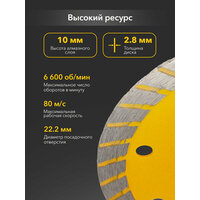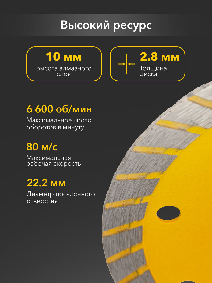 Алмазный отрезной Turbo диск 230x22.2 мм Kranz применяется для сухой резки строительных материалов, таких как природный и искусственный камень, армированный бетон, кирпич, керамика. При контакте с диском материалы не разрушаются, сохраняют свои свойства. Такая оснастка положительно влияет на прочность соединения. Используется в угловой шлифовальной машине, ручном электрическом плиткорезе, штроборезе. При установке необходимо руководствоваться стрелкой направления вращения диска. Состоит из синтетического алмаза и инструментальной стали, с обрабатываемой поверхностью контактирует только алмазная часть круга. Процесс резки сопровождается воздушным охлаждением, а избыток тепла отводится по корпусу. Универсальный диск отличается большими ресурсными показателями, точностью реза, высокой производительностью и низким уровнем шума. Диск использовать строго по назначению, а также соблюдать технику безопасности и использовать средства индивидуальной защиты. Срок годности не ограничен.
