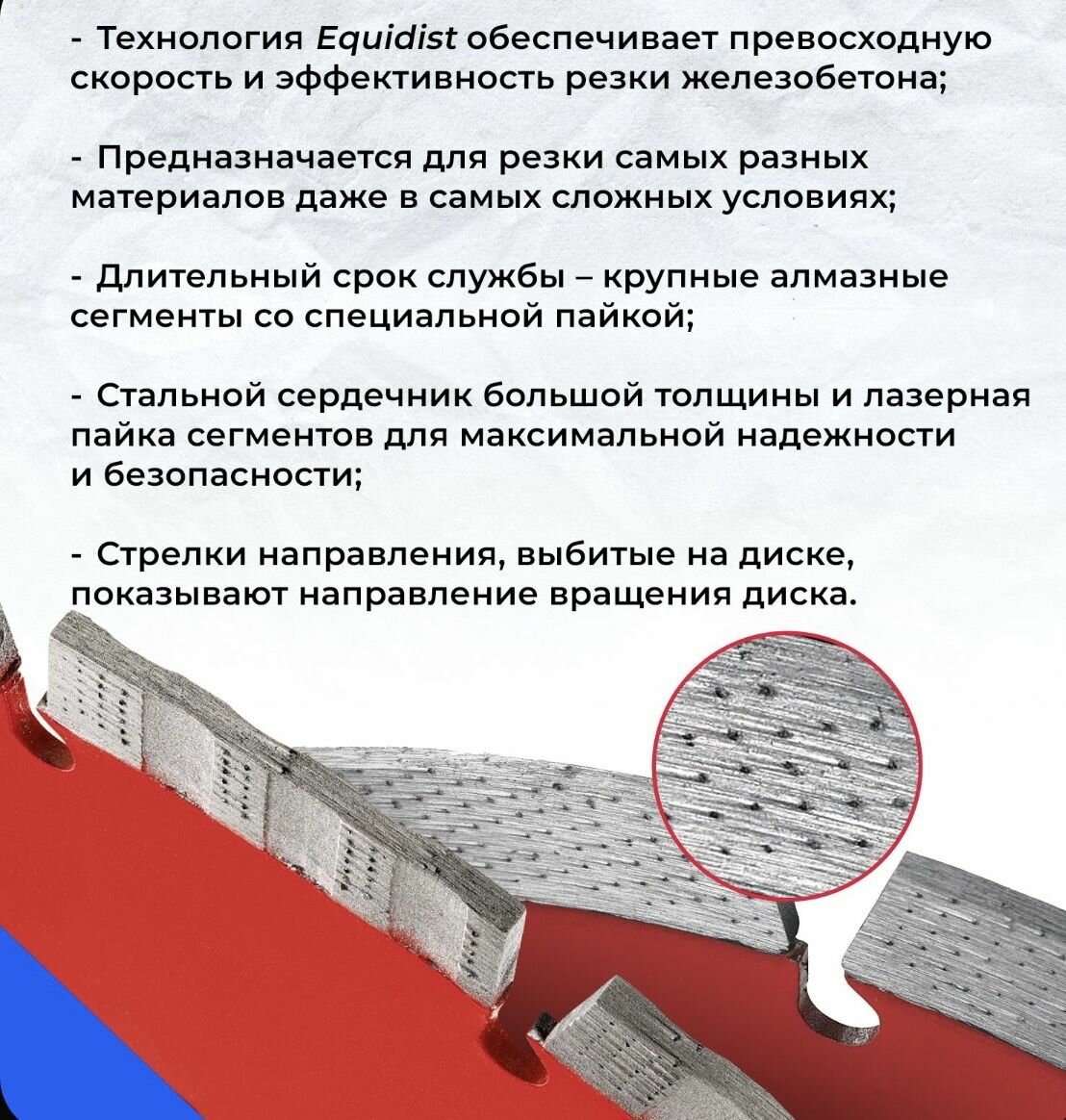 ПреимуществаТехнология Equidist обеспечивает превосходную скорость и эффективность резки железобетона - Предназначается для резки самых разных материалов даже в самых сложных условиях