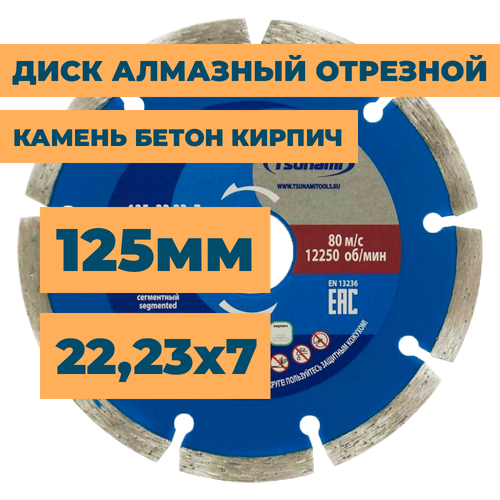 Диск алмазный по бетону, камню и кирпичу - это высококачественный инструмент для резки твердых материалов. Он оснащен отрезными сегментами, которые обеспечивают быструю и точную работу. Данный диск имеет диаметр 125 мм и посадочное отверстие 22,23 мм, что позволяет использовать его на большинстве болгарок и ушм.
