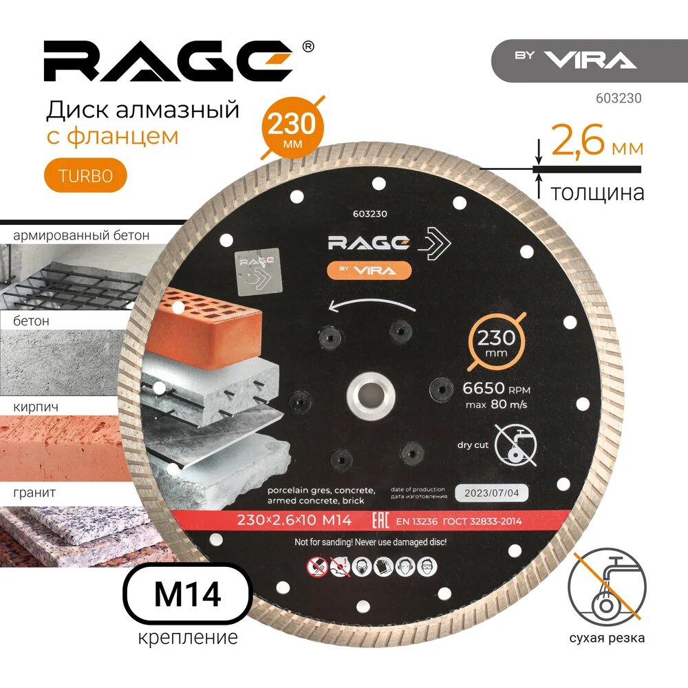 Диск алмазный по бетону Rage by Vira (603230) 230×22,23×2,4 мм турбо сухой рез: сравнение цен, характеристики, фото, актуальное наличие и цены.