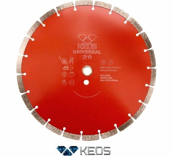 Диск алмазный сегментный KEOS сегментный используется для резки на УШМ и штроборезах, предназначен для угловых шлифовальных машин и резчиков. Применяется для резки железобетона, слабоармированного бетона, пенобетона, газобетона, кирпича, гранита и бутового камня.
