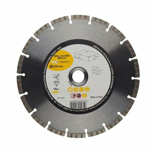 ### Особенности - Посадочный диаметр — 22,2 мм. - Внешний диаметр — 230 мм. - Тип абразива — промышленный алмаз. Обладает высокой твердостью и износостойкостью.