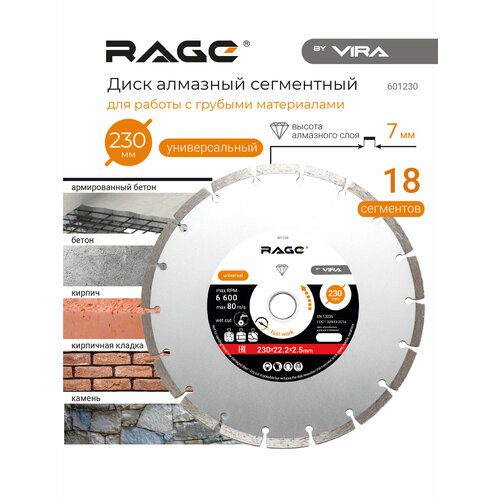 Диск алмазный сегментный RAGE by VIRA специализируется на резке широкого спектра абразивных стройматериалов и подходит как для бытового, так и промышленного применения. Отличается длительным рабочим ресурсом и высокой скоростью резки.