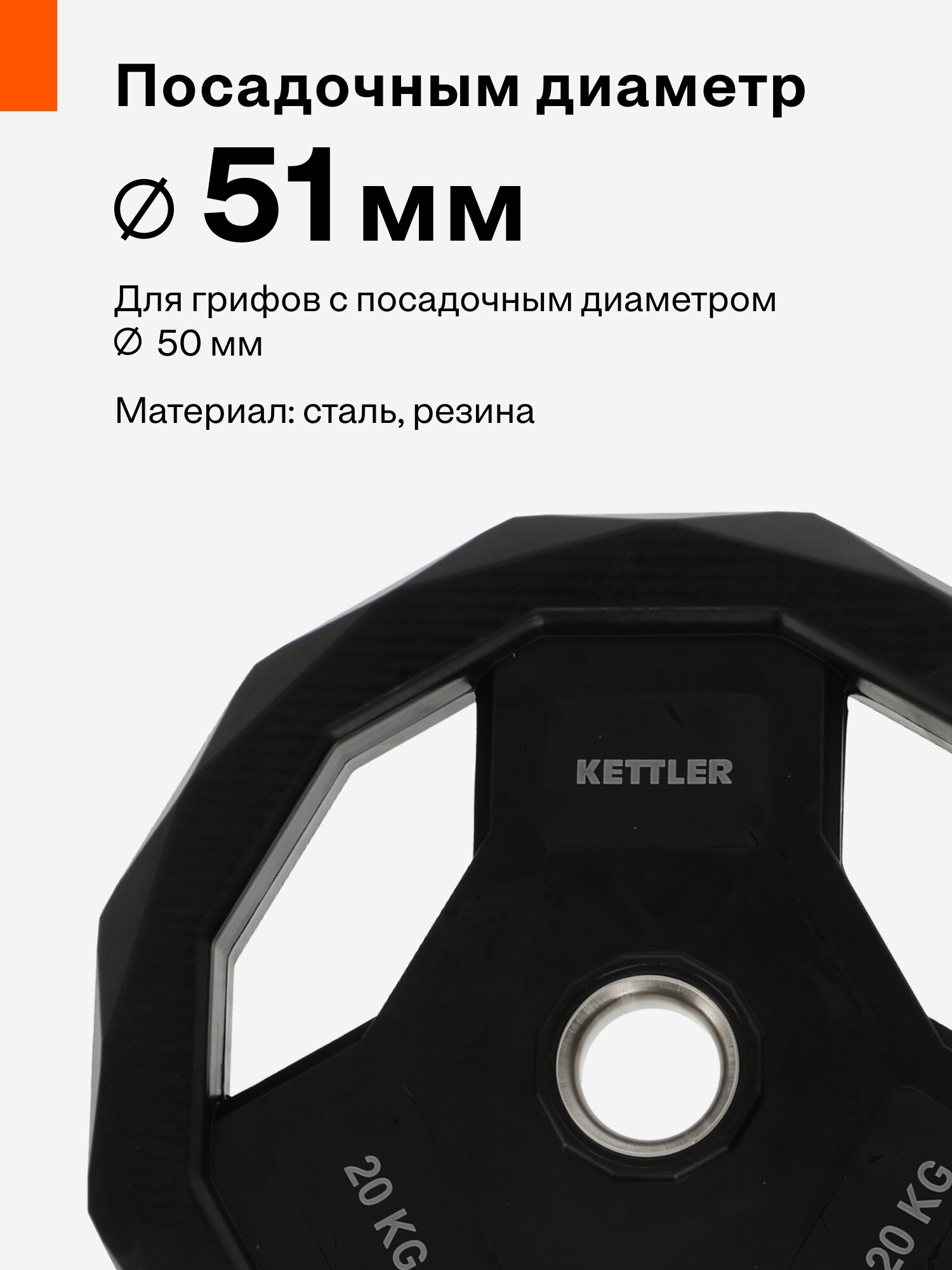 Прочный чугунный блин KETTLER с резиновым покрытием. Идеальный инструмент для эффективных и комфортных тренировок со свободными весами для достижения ваших спортивных целей. Преимущества: устойчив к ржавчине, тихий и не царапает пол. Эргономика блина позволяет использовать его как гантель, а кольцо из нержавеющей стали обеспечивает легкую установку на грифы диаметром 51 (подходит для олимпийских грифов с диаметром 50 мм). Вес блина 20 кг. Не упустите возможность улучшить свои тренировки с этим высококачественным продуктом от KETTLER.