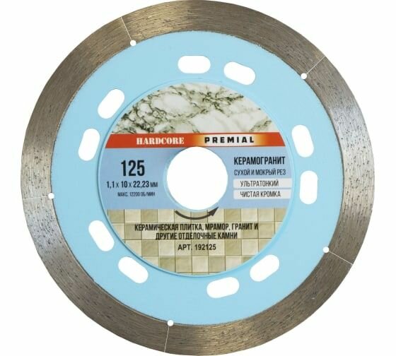 Диск алмазный Hardcore / Хардкор Premial по керамограниту, сухой и мокрый рез, диаметр 125мм, посадочный 22.23мм, высота сегмента 10мм, рез 1.1мм / расходные материалы и оснастка: сравнение цен, характеристики, фото, актуальное наличие и цены.