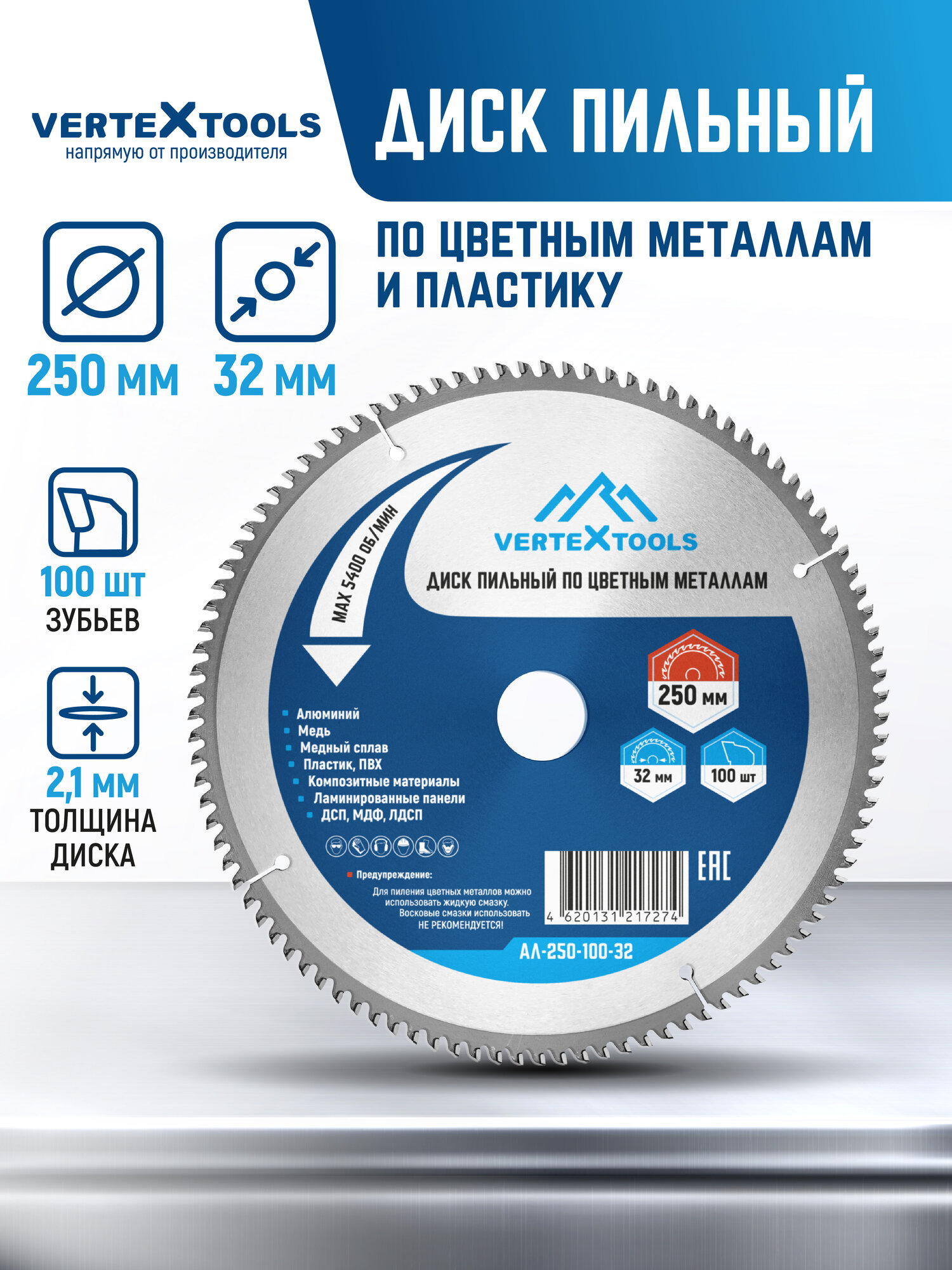 Диск пильный для циркулярных пил по алюминию и цветным металлам VertexTools 250×32 мм 100 зубьев: сравнение цен, характеристики, фото, актуальное наличие и цены.