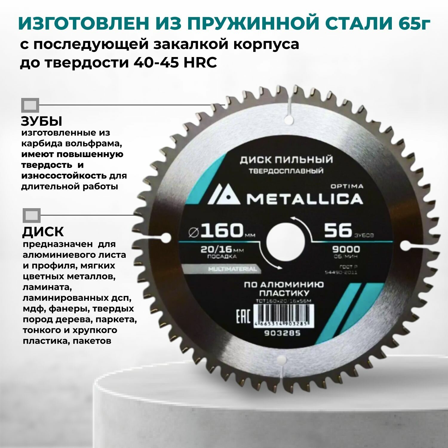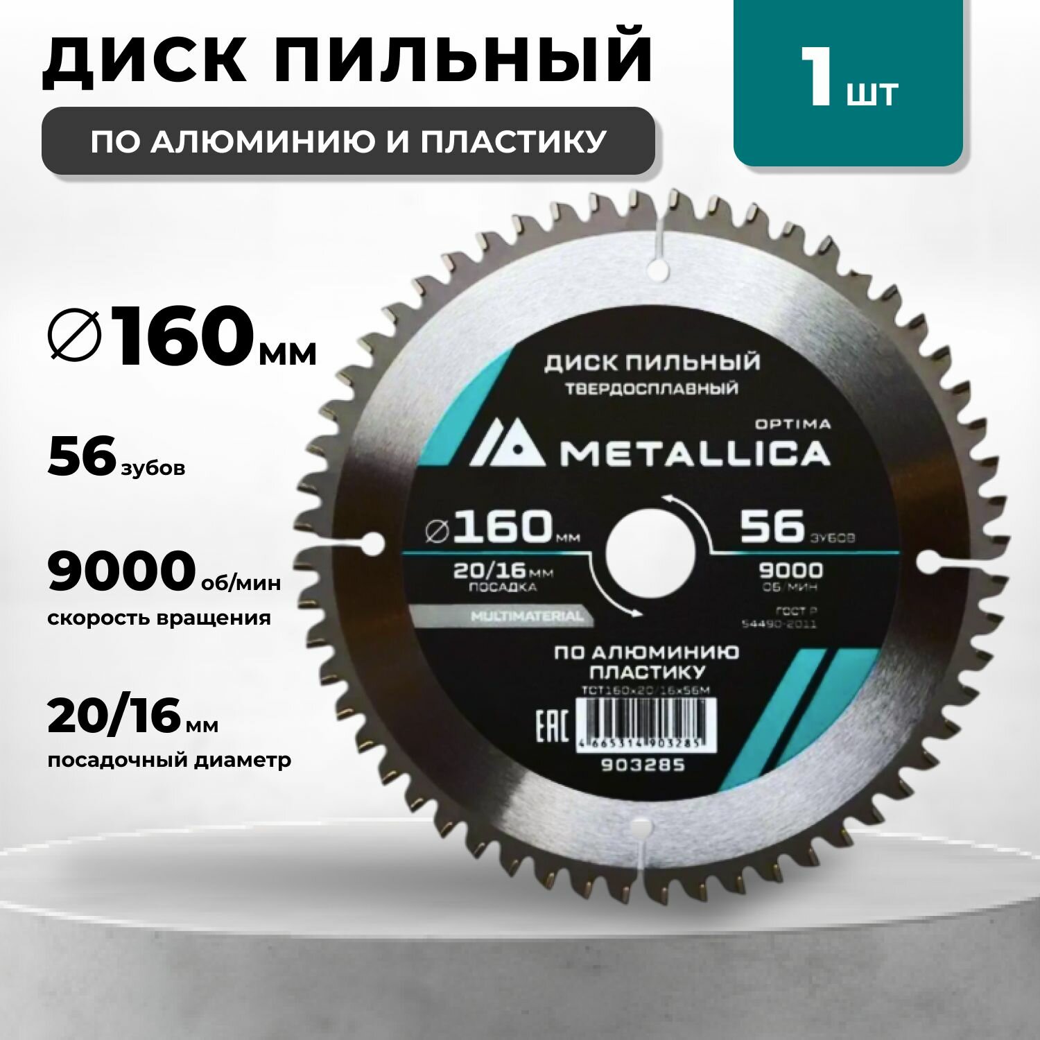 Диск пильный по алюминию и пластику 160×20/16 мм, 56 зубов твердосплавный METALLICA Optima Т2,4 мм: сравнение цен, характеристики, фото, актуальное наличие и цены.