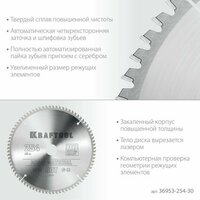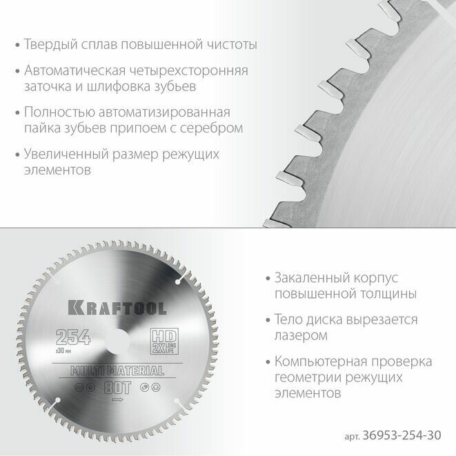 Пильный диск по алюминию KRAFTOOL 36953-254-30, используется для распилов в алюминиевых листах и плитах, пластиковых панелях, твердой и мягкой древесине, ламинированных плитах, ДСП с покрытием. Предназначен для ручных циркулярных пил, торцовочных и станковых пил. Увеличенный размер режущих элементов значительно увеличивает сопротивляемость нагрузкам. Закаленный корпус повышенной толщины из высоколегированной стали дольше сохраняет жесткость корпуса пильного диска. Компенсационные прорези снижают уровень шума при работе и препятствуют деформации диска от перегрева. Серия ″Multi Material″ позволяет резать разнообразные материалы, такие как цветные металлы, пластик, ламинированные плиты, комбинированные, полимерные и эпоксидные материалы.