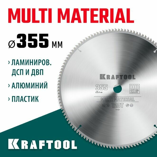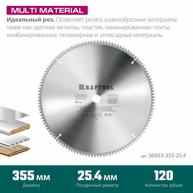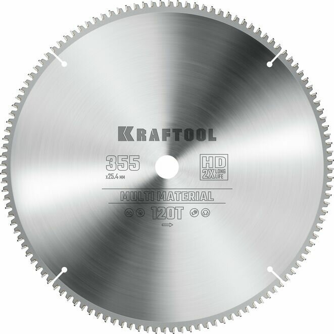Пильный диск по алюминию KRAFTOOL 36953-355-25.4, используется для распилов в алюминиевых листах и плитах, пластиковых панелях, твердой и мягкой древесине, ламинированных плитах, ДСП с покрытием. Предназначен для ручных циркулярных пил, торцовочных и станковых пил. Увеличенный размер режущих элементов значительно увеличивает сопротивляемость нагрузкам. Закаленный корпус повышенной толщины из высоколегированной стали дольше сохраняет жесткость корпуса пильного диска. Компенсационные прорези снижают уровень шума при работе и препятствуют деформации диска от перегрева. Серия ″Multi Material″ позволяет резать разнообразные материалы, такие как цветные металлы, пластик, ламинированные плиты, комбинированные, полимерные и эпоксидные материалы.