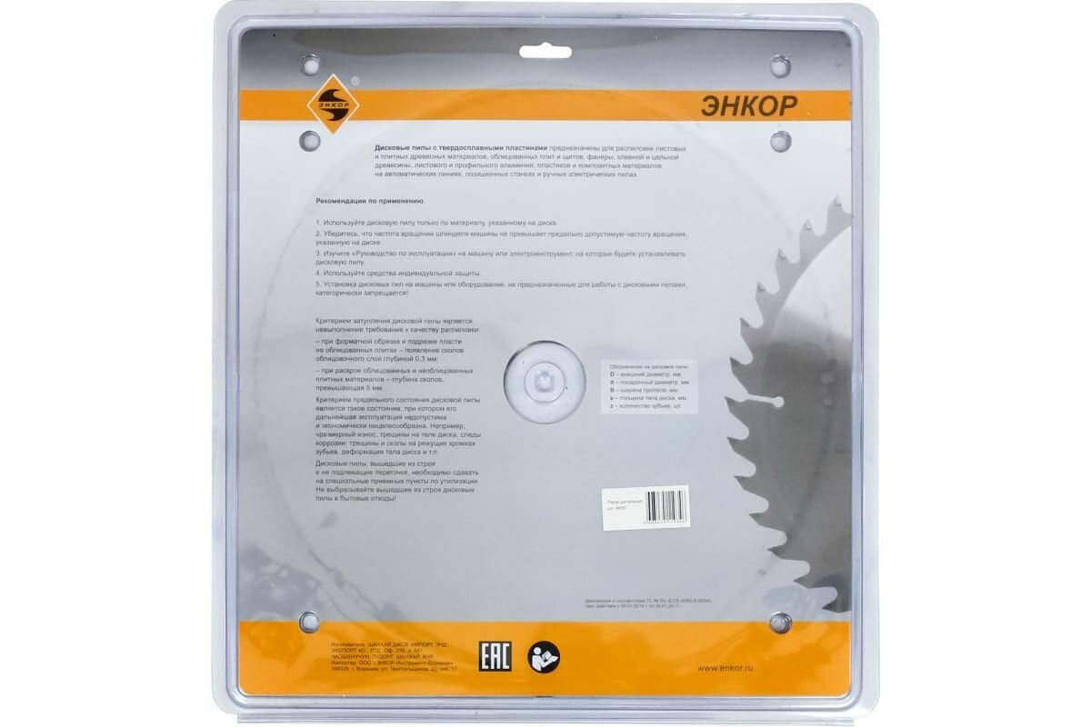 Диск пильный по дереву (350x50 z80) Энкор 48595 толщина нап.3,05/тело 2,15ммДиск Энкор по дереву является сменным элементом для торцовочных и циркулярных пил. Применяется для быстрого реза по мягкой и твердой древесине. Корпус диска изготовлен из инструментальной стали, а напайки выполнены из твёрдого сплава ВК8. Упаковка — индивидуальная картонная коробка.