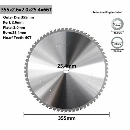 Диск изготовлен из карбида вольфрама, что обеспечивает его прочность и долговечность. Внешний диаметр диска составляет 355 мм, а посадочный диаметр - 25,4 мм. Количество зубьев - 66 штук, что гарантирует аккуратный и чистый рез.