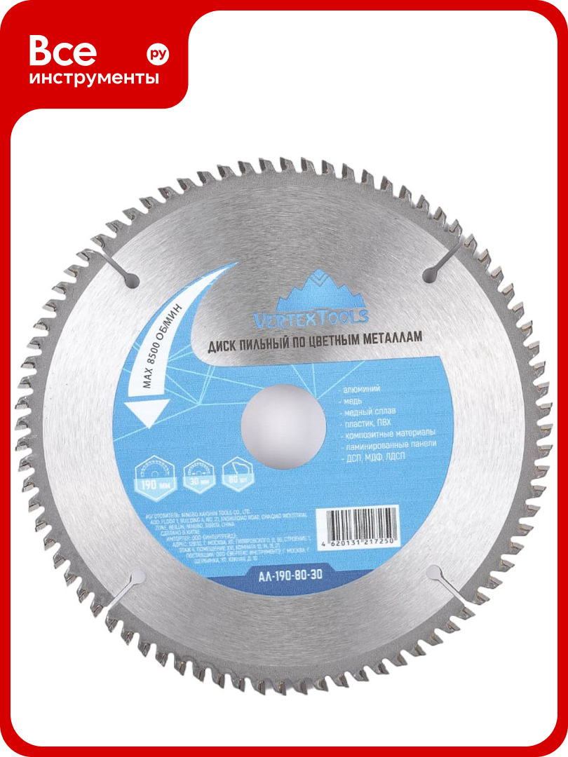 Диск пильный по цветным металлам и пластику (190×30 мм; Z=80) vertextools АЛ-190-80-30: сравнение цен, характеристики, фото, актуальное наличие и цены.