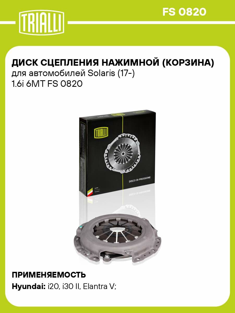 Купить Диск сцепления нажимной (корзина) для автомобилей Solaris (17-) 1.6i 6MT FS 0820 TRIALLI с доставкой по всей России.
