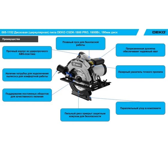 Дисковая (циркулярная) пила DEKO CSDK-1800 PRO, 1800Вт, 190мм диск поддержание оборотов, плавный пуск 085-1152: сравнение цен, характеристики, фото, актуальное наличие и цены.