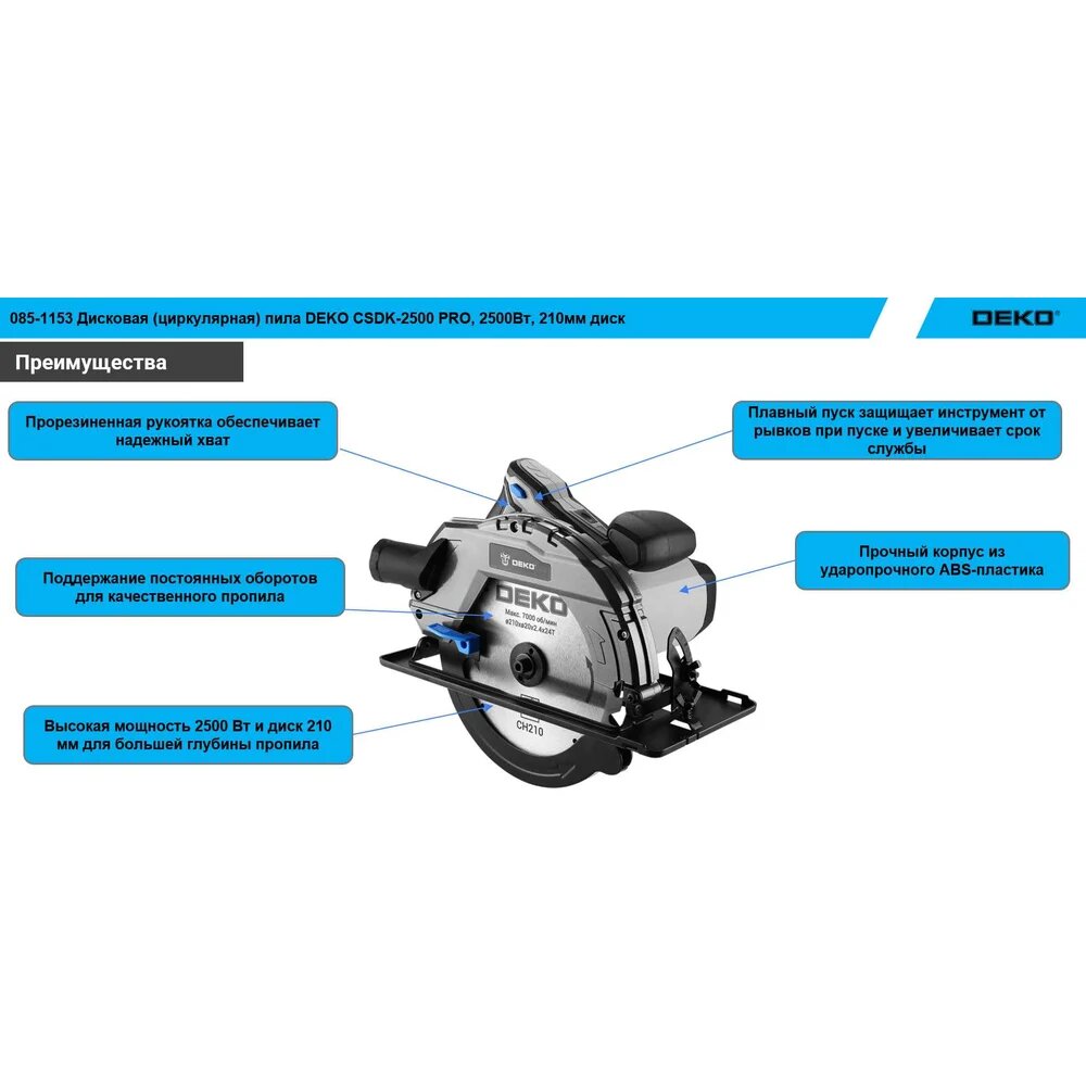 Купить Дисковая (циркулярная) пила DEKO CSDK-2500 PRO, 2500Вт, 210мм диск 085-1153 с доставкой по всей России. Дисковая (циркулярная) пила DEKO CSDK-2500 PRO, 2500Вт, 210мм диск 085-1153: сравнение цен, характеристики, фото, актуальное наличие и цены.