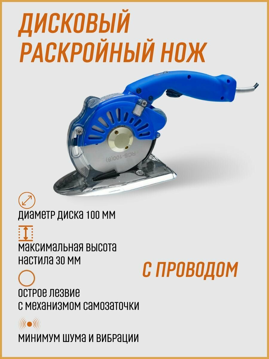 Red Shark RS-T100D-BL (blue) - раскройный дисковый нож с проводом (длиной 2 м 20см). Предназначен для раскроя небольших настилов. Рекомендован для использования на фабриках и в ателье.