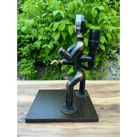 Этот держатель для бутылки не только очень удобен в использовании, но и отлично впишется в интерьер. Как он работает? Открытая бутылка вставляется в цилиндрическое отверстие сзади диспенсера. Важно сделать это так, чтобы не пролить содержимое — нужно надеть приспособление сверху на горлышко бутылки, а затем перевернуть её дном кверху. При открывании крана жидкость будет вытекать под действием силы тяжести.
