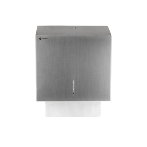 Устройство снабжено стальным барабанным замком заподлицо с поверхностью, а сварные соединения зашлифованы, образуя гладкую поверхность. Благодаря удобному окошку вы всегда будете знать, когда нужно пополнить запасы бумажных полотенец.