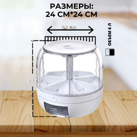 Основной особенностью этого диспенсера является его вращающаяся конструкция, обеспечивающая легкий доступ к содержимому каждой из 6 секций. Благодаря этому, вы сможете быстро и удобно выбирать необходимый продукт, не перебирая другие контейнеры.