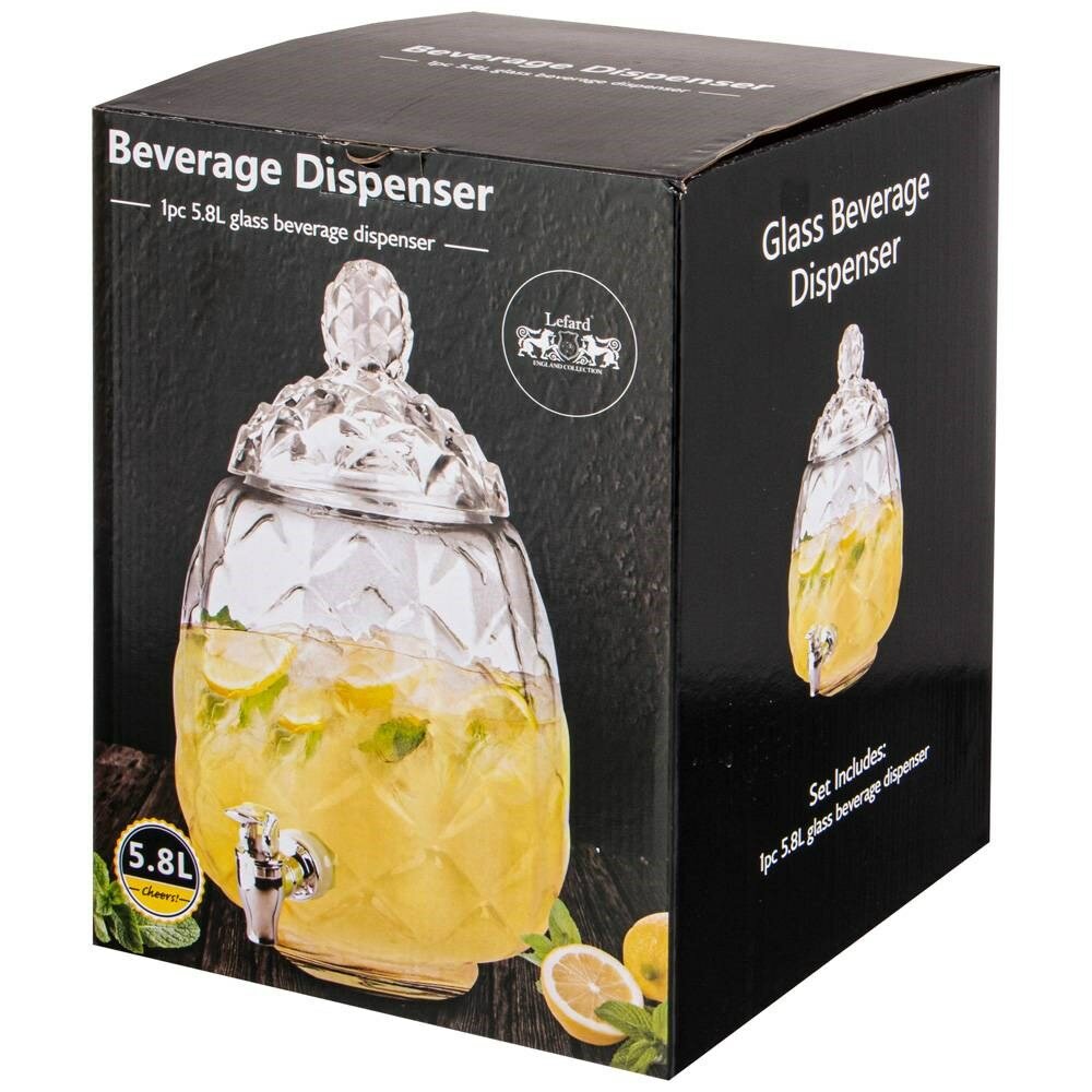 Кухонный диспенсер лимонадница из стекла с крышкой и краном под хром станет отличным вариантом украшения кухни, сервировки стола, поможет не только утолить жажду, но и обеспечит свободный доступ к напиткам. Используйте диспенсер для кваса, морса, фруктовой воды, сока, компотов, мохито, алкогольных и безалкогольных пуншей, напитков. Оригинальный узор стеклянного корпуса, привлекательная крышка, практичный объем 5,8 литров, хромированный кран и красочная упаковка - в этой лимонаднице предусмотрено все, чтобы стать настоящим притяжением взглядов и желанным подарком на день рождения, 23 февраля, 8 марта, новоселье, свадьбу, годовщину, любой повод, чтобы порадовать себя, родных и близких.