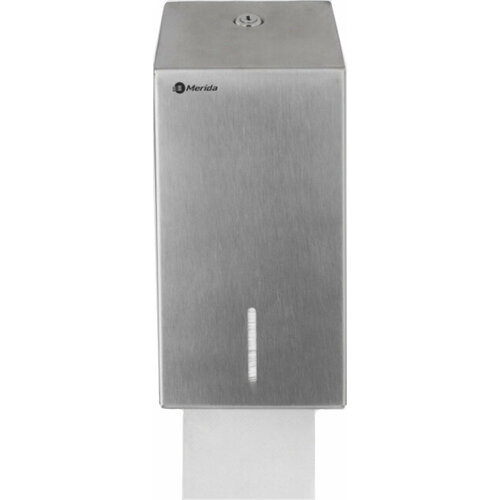 Диспенсер Merida STELLA R BSM401. R предназначен для размещения и подачи туалетной бумаги в листах в общественных санитарных узлах гостиниц, предприятий общепита, медицинских учреждений и других мест массового пребывания. Модель оснащена запираемым на ключ барабанным замком. Корпус изготовлен из полированной нержавеющей стали AISI 304, окошко выдачи обработано лаком AntiFinger. Особенности: Дозирующее отверстие специальной формы для точного и экономного полистового расхода Контроль наличия бумаги через окошко Механический способ подачи Дополнительные характеристики: Вместимость: 400 шт. Толщина стали: 1 мм