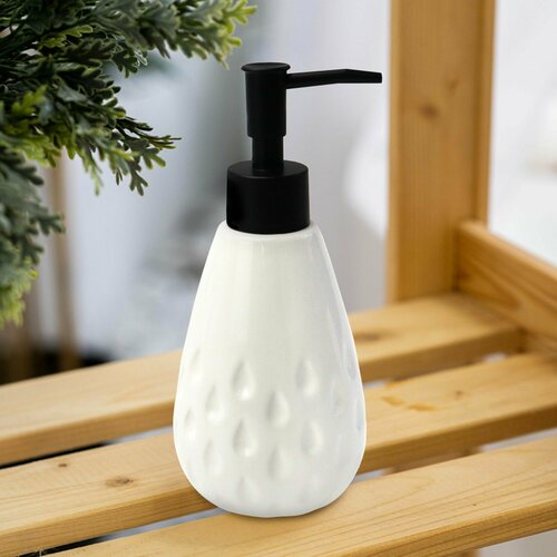 Диспенсер для моющего средства «Emerald» — это незаменимый аксессуар для вашей кухни или ванной комнаты. Этот дозатор для жидкого мыла грушевидной формы с легким тактильным орнаментом в форме капли выполнен в стильном цвете. Керамический флакон дополняет изящный пластиковый носик черного цвета, что придает изделию современный вид.