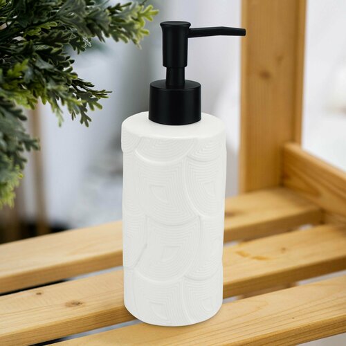 Флакон для мыла жидкого из керамики дополняется изящным пластиковым носиком черного цвета, обеспечивая аккуратное и экономное дозирование моющего средства. Размер дозатора для мыла составляет 6,9 х 6,9 х 18,6 см, а объем — 350 мл. Керамический диспенсер для моющего средства устойчив к влажной среде, что делает его идеальным выбором как для ванной комнаты, так и для кухни.