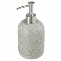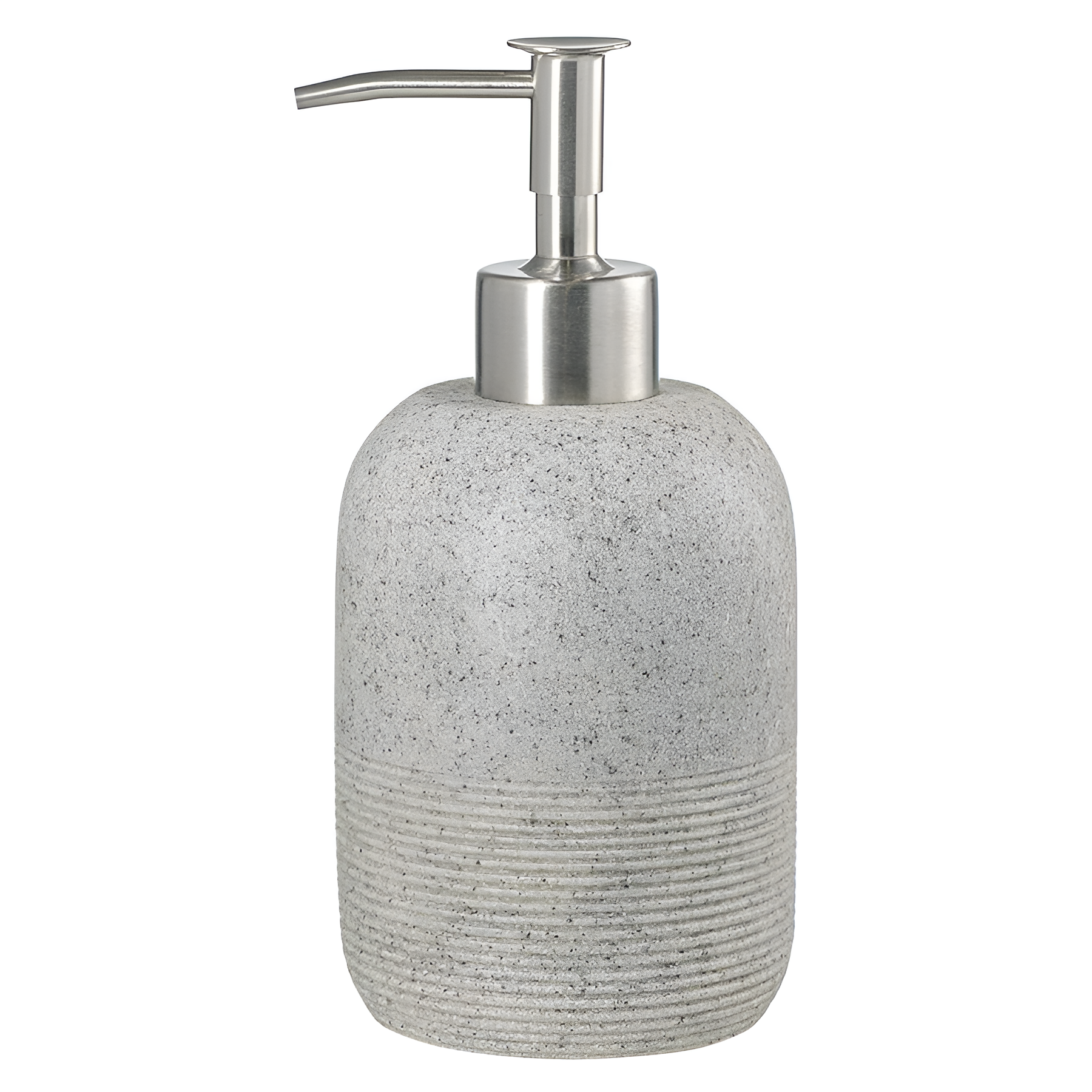 Диспенсер для жидкого мыла Loup имеет корпус из полирезина, стилизованного под натуральный камень темно-серого оттенка. Материал отличается устойчивостью к влаге, ударам и царапинам, что делает его идеальным выбором для ванной комнаты. Наружные элементы дозирующего механизма выполнены из нержавеющей стали, обладающей высокой прочностью, долговечностью и отличными антикоррозионными свойствами. Кроме того, ее блестящая поверхность придает изделию презентабельный вид.