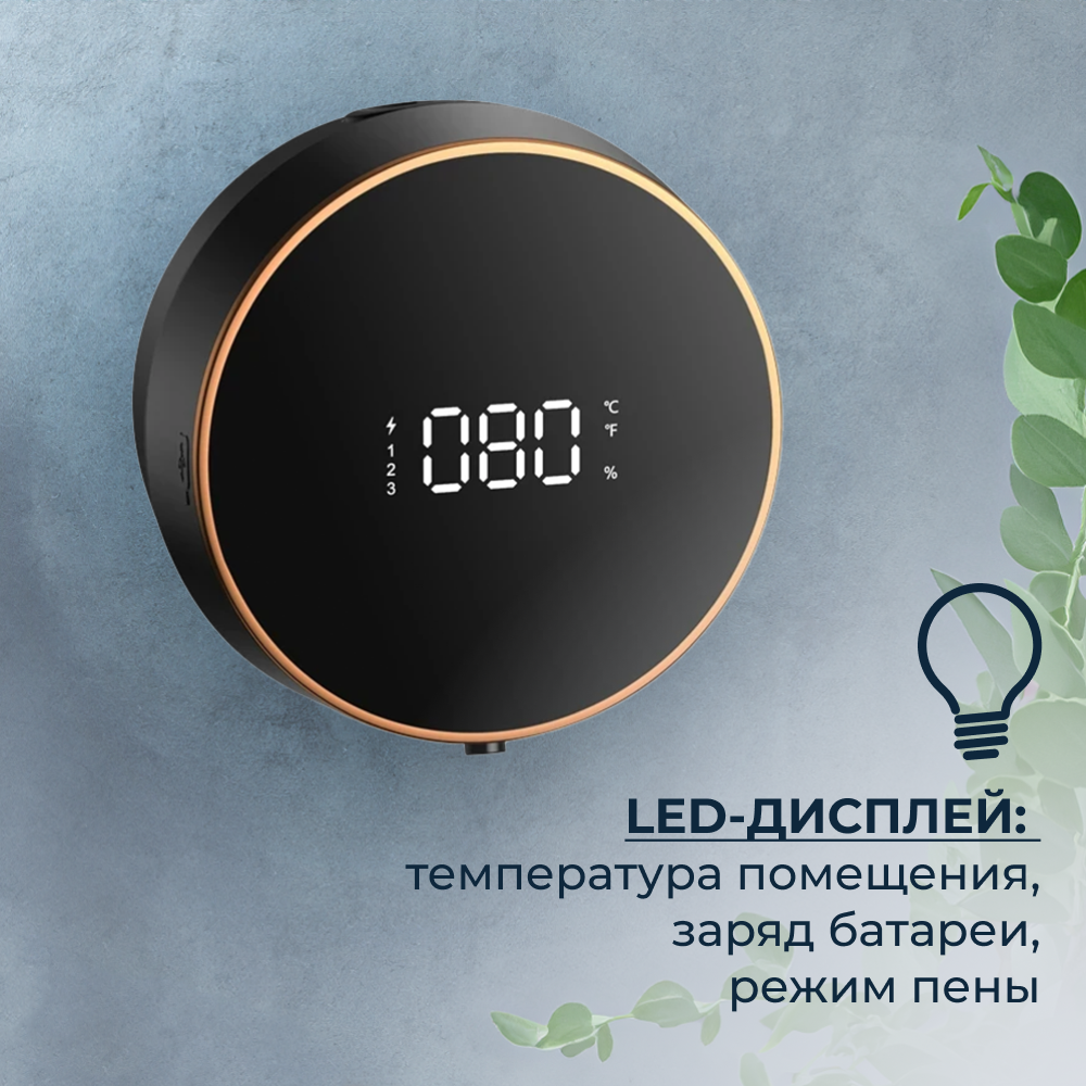 На дисплее отображается температура в комнате, заряд аккумулятора и режимы подачи пены. Сенсорный дозатор/диспенсер для ванной комнаты может работать в трех режимах подачи пены.
