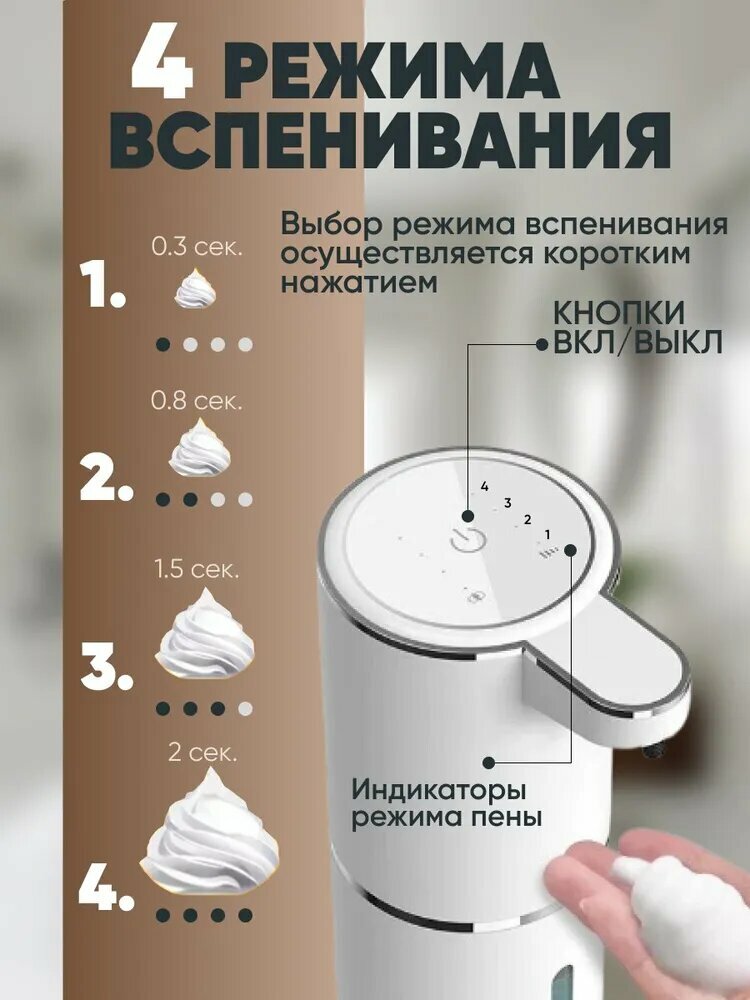 4 режима вспенивая мыла, которые вы можете сами регулировать нажатием на сенсорную кнопку. Дозатор запомнит Ваш выбор.
