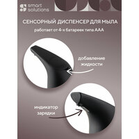 Диспенсер работает от 4-х батареек типа ААА, которые вставляются в нижней части устройства. Мигающий индикатор сообщает о низком уровне заряда и о необходимости замены источника питания. Жидкость добавляется через верхнюю часть корпуса. Одна порция мыла приблизительно равна 1 мл. Для увеличения дозировки необходимо подержать руки под датчиком около 2 секунд. Оптимальное расстояние от рук до сенсора – 5 см.