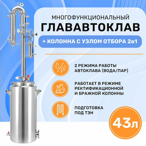 Дистиллятор автоклав 2в1 ГлавАвтоклав 43 л с колонной для ректификации Русич для самогонного аппарата 2 дюйма - это уникальное устройство, которое объединяет в себе функции автоклава и самогонного аппарата.