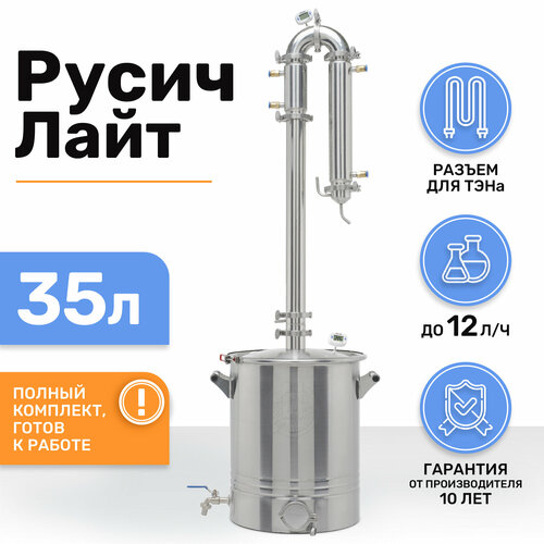 | Подробная комплектация | Холодильник, дефлегматор, царга 50 см, узел отбора голов и хвостов, 2 поворота на 90 градусов, перегонный куб, 4 пневмофиттинга, набор силиконовых уплотнений, краник, носик с ТСА, набор кламповых хомутов, клапан сброса давления, 3 цифровых термометра, шланг 4м, тройник, игольчатый кран 2 шт, дивертор, РПН медная 90 см, спиртомер бытовой, книга рецептов, инструкция |