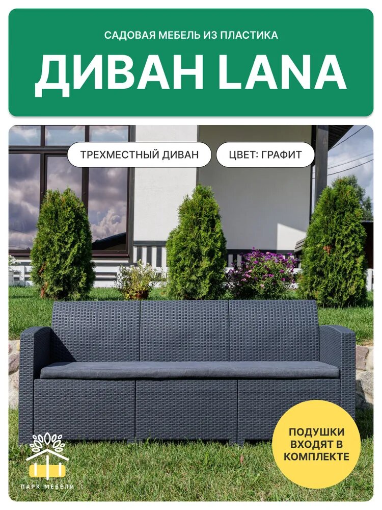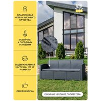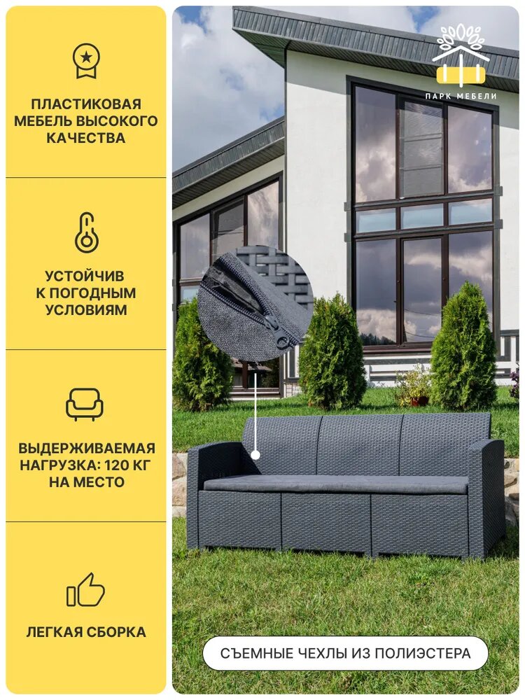 Ключевые преимущества: Прочность и долговечность – каркас пластиковой мебели садовой устойчив к дождю, УФ-излучению и перепадам температур (от -50°C до +50°C) Комфортные подушки – наполнитель из поролона в износостойких полиэстеровых чехлах Современный дизайн – лаконичный и универсальный цвет Практичность – простая сборка (диван трехместный поставляется в разобранном виде) и легкий уход