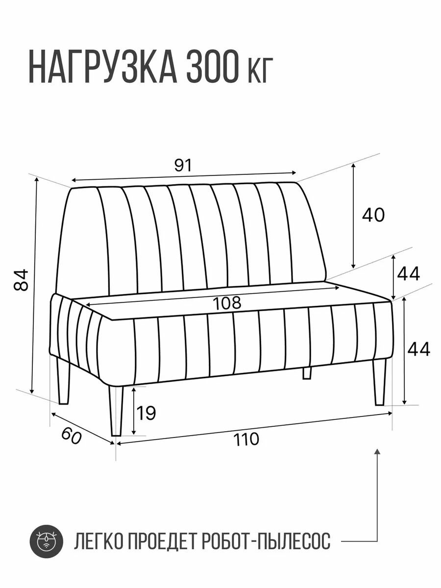 - Длина дивана 110 см, глубина сиденья 44 см, высота дивана 83 см, высота от пола до сиденья 43 см.