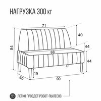 - Длина дивана 90 см, глубина сиденья 44 см, высота дивана 83 см, высота от пола до сиденья 43 см.