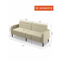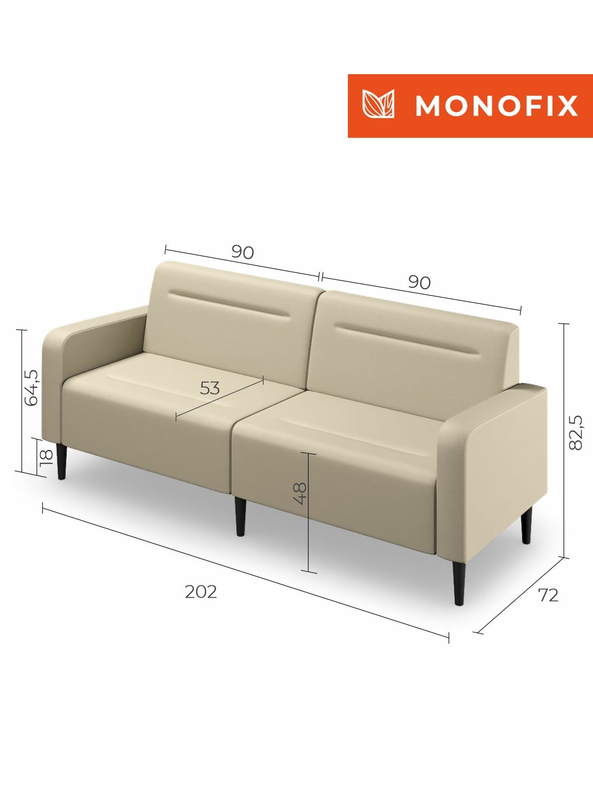 Офисный диван фоксет 2 метра в обивке из экокожи легко впишется в любой интерьер. Прямой нераскладной диван на ножках можно поставить в комнату, зал, гостиную или на дачу. Он прекрасно подойдет для общественных помещений: как мебель для офиса, зоны ожидания, салона красоты, шоу-рума. Ширина большого кожаного дивана 200 см, ножки выполнены из массива дерева и окрашены в черный цвет. Мягкие защитные противоскользящие накладки на ножках защитят пол от повреждений. На обивке из экокожи декоративная горизонтальная отстрочка - придает строгость и индивидуальность изделию. Современный минималистичный диван фоксет из кожзама от Монофикс станет стильным и функциональным предметом вашего интерьера, подойдет для современного стиля, лофт, минимализм.