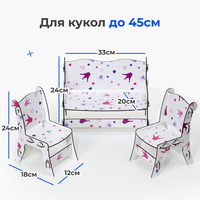 Диван и стулья для кукол из лхдф для девочек сочетает в себе различные элементы для игры. Это стулья для кукол с элегантной резной формой и прочным корпусом с красочными принтами. Кукольный диван идеален для сюжетно-ролевых игр, он вмещает 2-х кукол 45 и 53 см ( на фото в карточке товара), набор помогает развивать фантазию, аккуратность, понимание ответственности и заботы, а также мелкую моторику. Игра с кукольным домиком учит детей взаимодействию, общению и разрешению конфликтов. Уход за куклой, уборка и укладка развивают ответственность за свои вещи. Кукольная мебель для детской комнаты включает множество видов: миниатюрные стулья, кровати, диваны, манежи, комоды, гардеробы, туалетные столики и другие предметы интерьера. Она выполнена из различных материалов, включая дерево, фанеру, металл и текстиль. Некоторые предметы мебели обладают функциональными элементами, такими как раскладывающиеся кровати и открывающиеся ящики, стимулируя детское воображение и творческие способности. Набор мебели для кукол подойдёт для игры с классическими пупсами и куклами популярных брендов вроде бэби борн (baby born), барби или реборн. Вариант мебели для barbie, куда поместятся несколько кукол. Рекомендуемая длина пупса — до 45 см. Этот набор -диван и стулья дл кукол в классическом стиле — прекрасный подарок для девочки на 8 марта, Новый год и день рождения, подарок дочери или внучке.