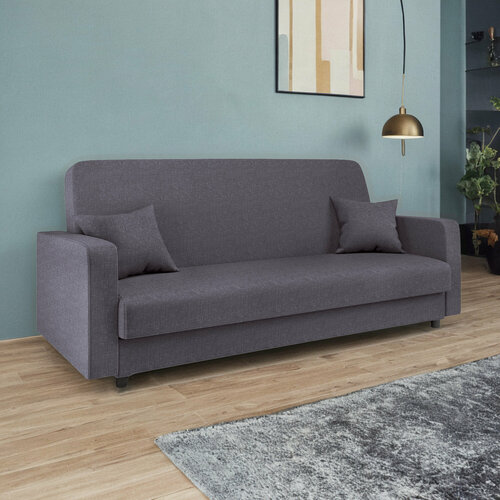 Обивка дивана выполнена из текстиля в виде серой рогожки, что придает ему классический и современный вид. Материал обивки долговечен и прост в уходе, что обеспечивает долгий срок службы дивана.